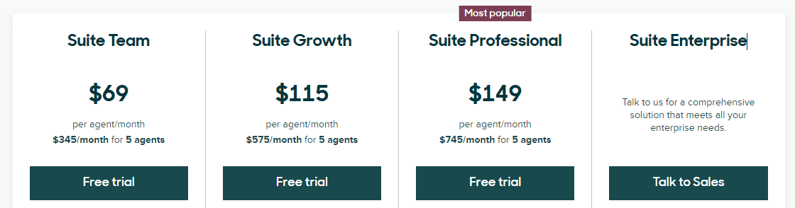 - Suite Growth: Starting at $115/month, this plan includes all the features of Suite Team, plus advanced analytics, reporting, and automation capabilities.