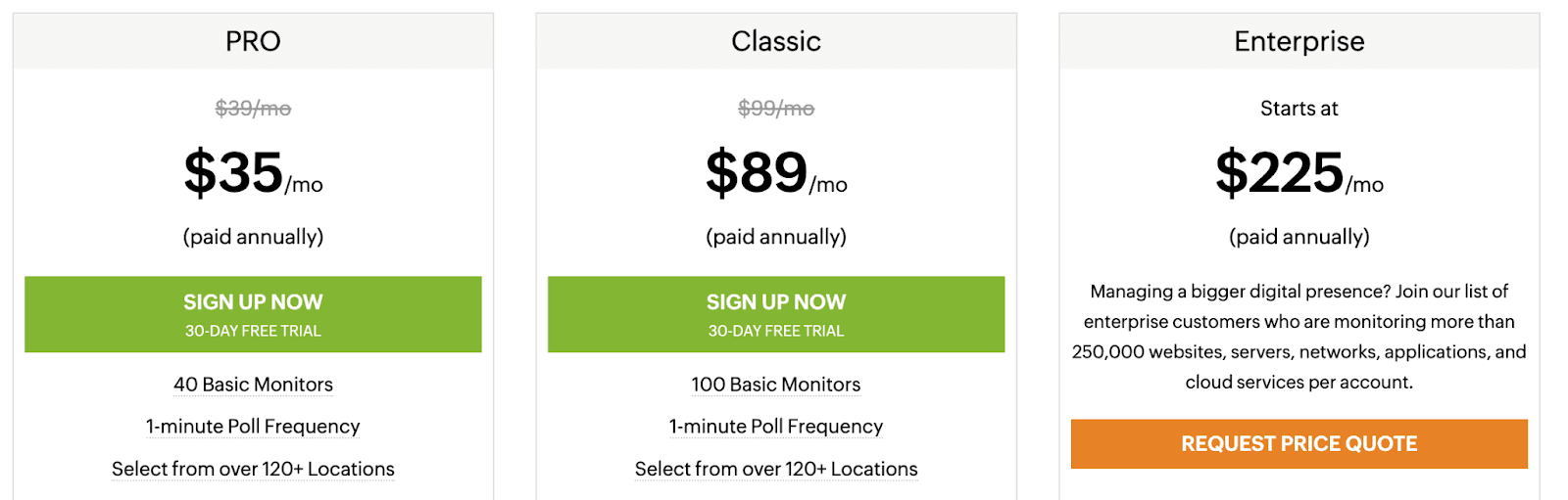 - Enterprise: $49.95 per month. Includes monitors, 1-minute monitoring frequency, and 365-day data retention.