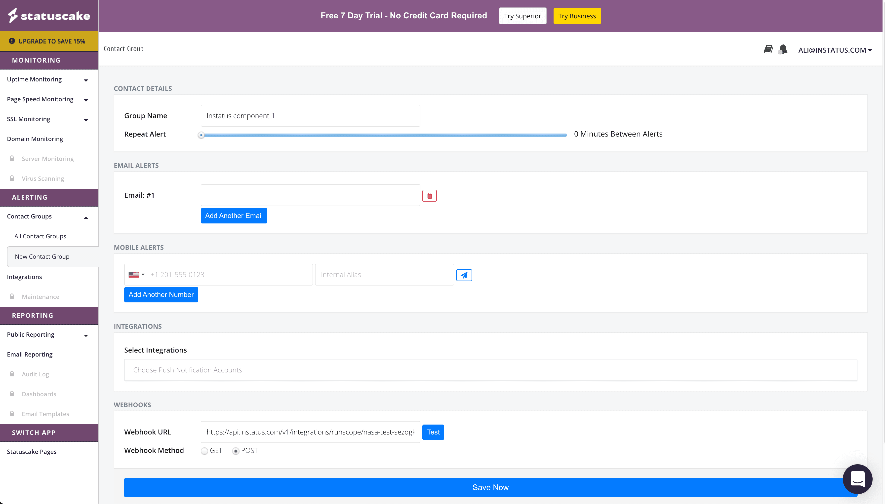 - Go to Instatus, under Integrations, select StatusCake