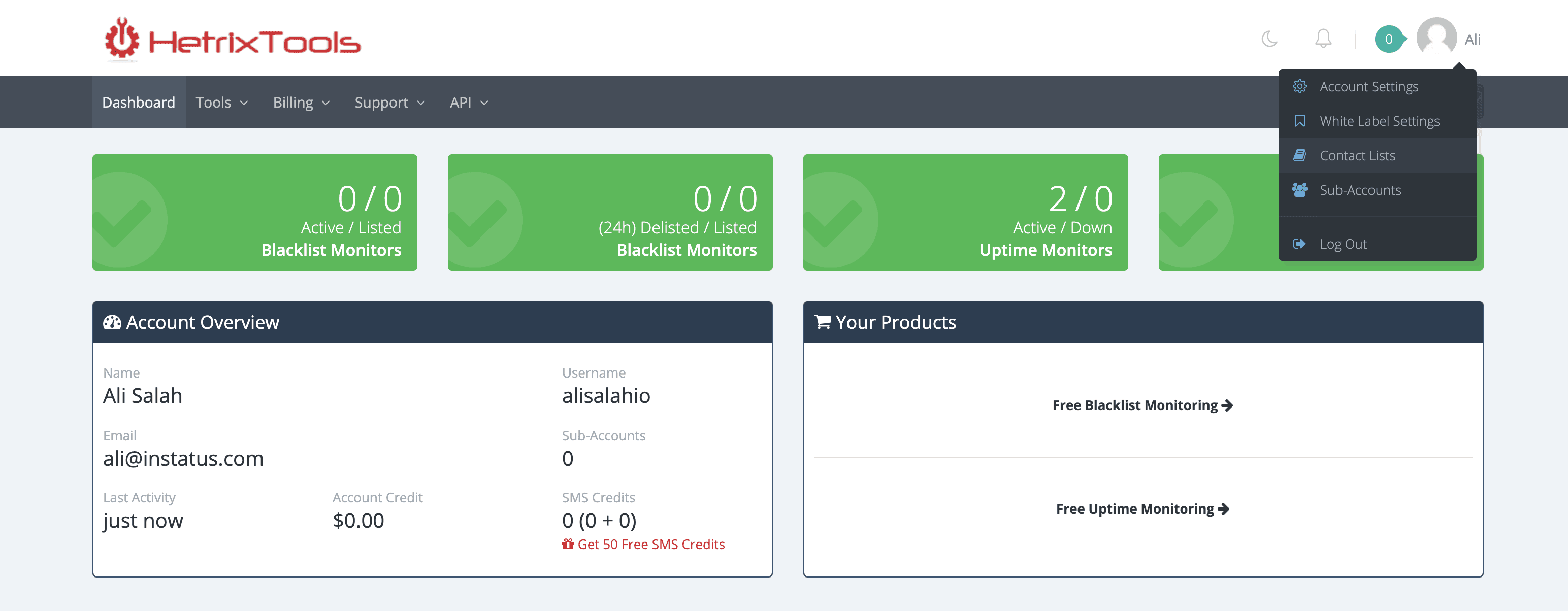 - Open your HetrixTools dashboard. Select your user avatar -> contact lists.